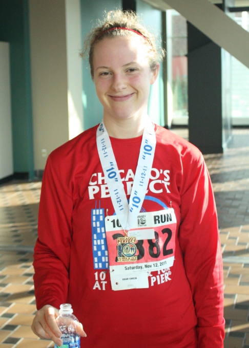 Just a month after running her first 5k, Sara ran a 10k at Navy Pier last weekend. For some reason the chip didn’t record her time, so that means it doesn’t count and she has to do it over. No, just kidding, but it was a little disappointing. Sara’s unofficial time was 70 minutes, 50 seconds, which is pretty awesome. Especially when you consider this race was a lot more hilly than the 5k she ran.