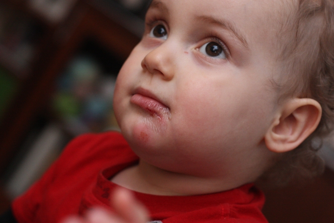 Last Wednesday, Oliver was running in the park and tripped over his own feet, falling just so that his chin slammed into a bench, causing him to bite deeply into his lower lip.