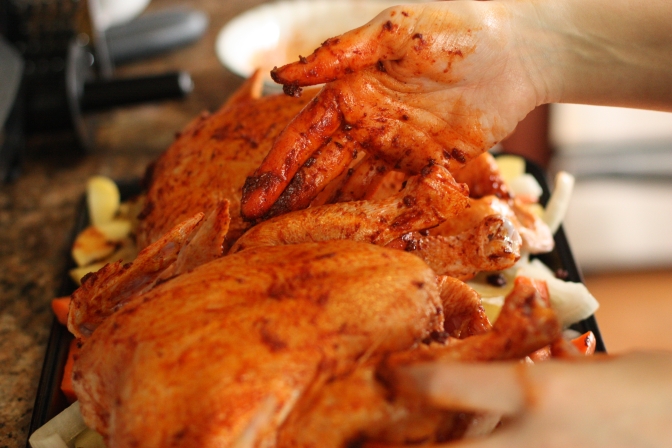 The reason for this recipe is sort of round-about. Sara likes to make chicken stock, but it’s kind of a pain. In order to maximize the efficiency of this activity, it helps to have a recipe involving TWO ENTIRE CHICKENS, so you can do all the chicken stock in one go. So yeah, the big plus of this recipe is that it outputs two chicken corpses.