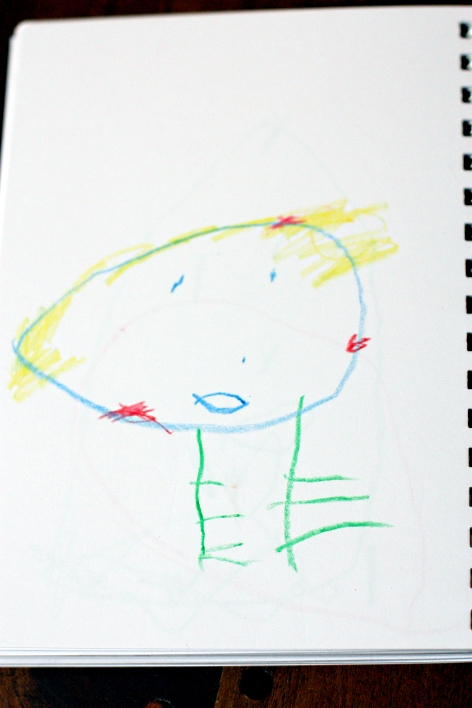 It’s not like it happened little by little, he just all of a sudden drew something recognizable. There is a mouth, nose, and eyes. He picked the right hair color. And it’s even anatomically correct, in the sense that if you were crippled with only 4 toes on one foot and 3 toes on the other, you’d be pretty clumsy, and probably covered in bloody spots.