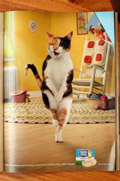 Evie’s selections were decidedly bizarre, such as this picture of a cat holding its privates, folded over at least twice in two different magazines: