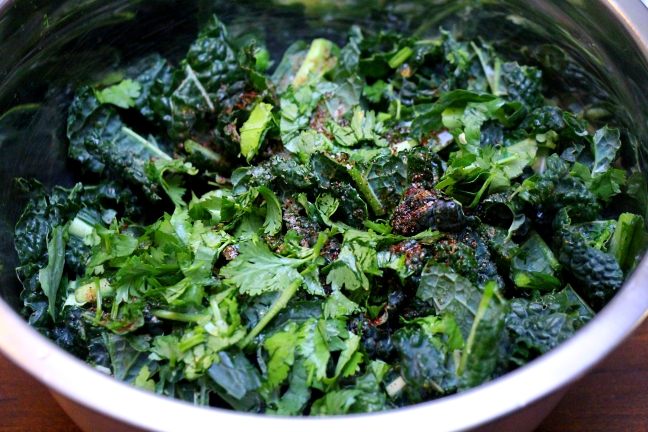 As with all kale recipes, de-stemming and chopping is the hardest part. I’m not particularly stringent on the de-stemming part, but I do try to take out the largest parts. It also helps to employ child labor.
