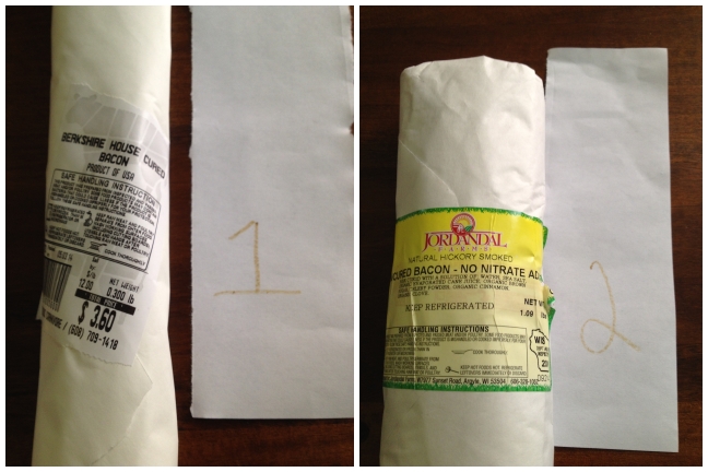 | Jordanal Farms Hickory Smoked, Cured | 9 | Giant pieces – looked like a lot of fat but didn’t taste fatty; thicker cut; what I would classify as eggs and bacon bacon. Clearly whole meat cut. |