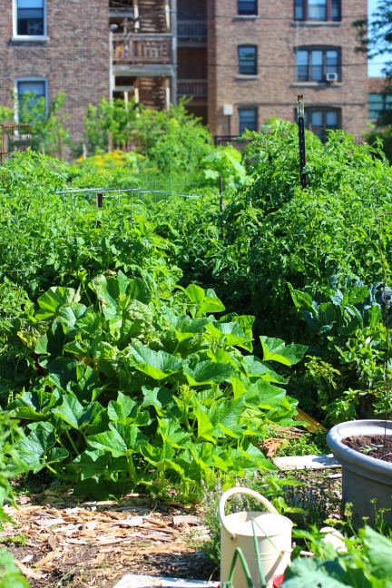 There is also some mystery squash / pumpkin / cantaloup / the Audrey II slowly exploding out of / taking over the chard. We didn’t plant it, but it seemed too big and healthy to pull. A little TOO big and healthy at this point, but we might as well see it through.