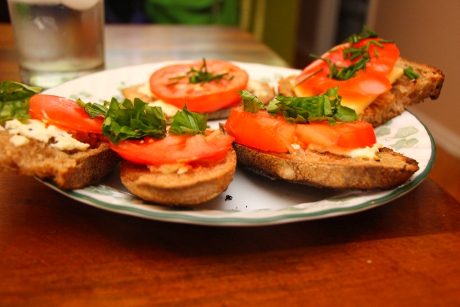 Alright, look. So it’s not really a recipe, and I’m sure I didn’t invent it. It’s tomatoes, cheese, and bread, toasted. It doesn’t matter. IT IS SO RIDICULOUSLY TASTY. Just make it.