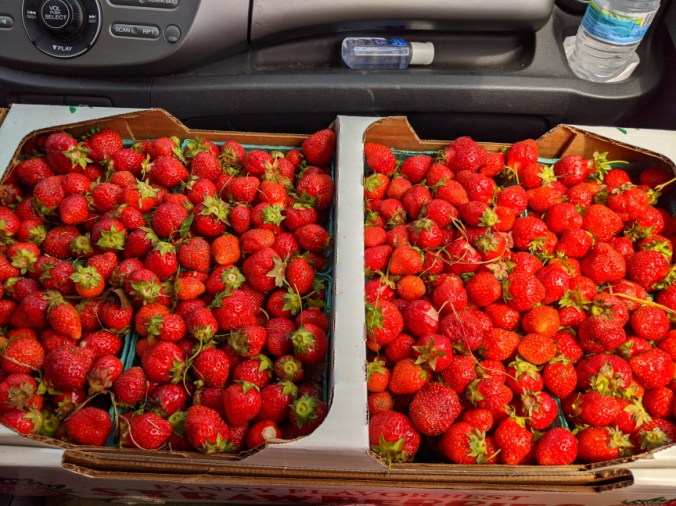 We also stopped and grabbed some already-picked strawberries from a u-pick place (and since I am late in posting this, Sara has already turned all of this into many, many jars of jam!)