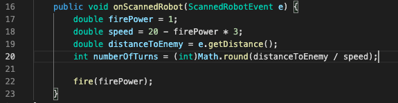 So you can see that after you fire, you will need to wait a bit before you can fire again. You will also need to determine how “hard” to shoot. In our robot, we were always using a fire power of 1. However, fire power can be anywhere between 0.1 and 3.0. The larger the fire power the slower the bullet will travel, however, the more damage it will do. Bullet damage is calculated as follows: