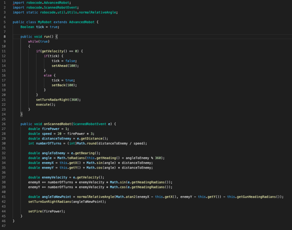 Additionally, robocode allows us to react to events. For example, when our robot scans another robot, it will send a “ScannedRobotEvent”. We can react to that event, for example, firing at the robot we scanned with our radar.