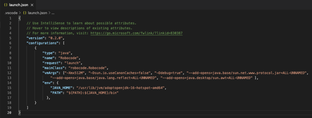This will tell VSCode how to start Robocode with all of the required environment variables and command line arguments.