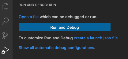 First, we need to tell VSCode how to run and debug this type of application. Click on the “Run and Debug” button the side bar, and then click the “create a launch.json file” link.
