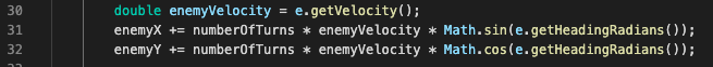 The next piece to know is how fast the enemy is moving. Luckily, our radar tells us that too, via the getVelocity() function on the ScannedRobotEvent)! So all we need to do is look at where the robot is currently and then…