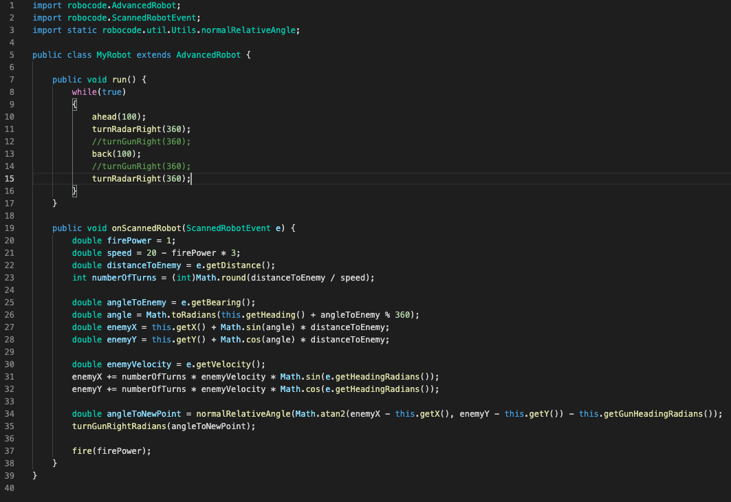 In addition to functions like ahead, back, turnRadarRight, turnGunRight, and fire, there are “set” versions of all of those functions (setAhead, setBack, setTurnRadarRight, setTurnGunRight, and setFire, respectively). These will tell the robot what we want to do, but will not actually execute those commands. Finally, we call execute at the end of the game loop to have them all execute in one go. So instead of moving, then turning the radar, then shooting, we can move, turn the radar, and shoot, all at the same time. Try this: