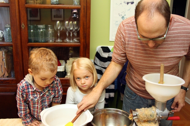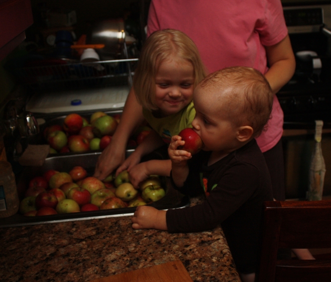 Both Evie and Oliver were pretty keen to help with the applesauce. Evie was actually a big helper all day, both with the actual apples (she cleaned almost all of them by herself), and also with just staying occupied and letting Sara and I get the work done.