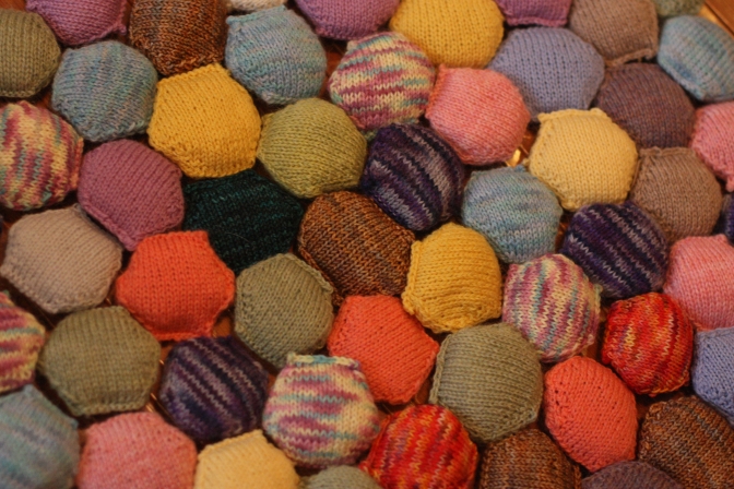 Yeah, okay. But still, even through knitting this one honeycomb, I’ve already gotten noticeably better as I get practice. The first 10 rows took 100 times longer than the entire rest of it. So I’m sure I’ll be an old pro by the time I knit 50 or so more. That’s the nice thing about knitting: you improve so quickly, that you really get that positive feedback, like “Hey, I did it! I can see that I’m improving!”, which is encouraging. It’s a lot better than something like playing accordion, where you have to practice and practice and practice and even then you can’t really tell if you’ve improved or not.