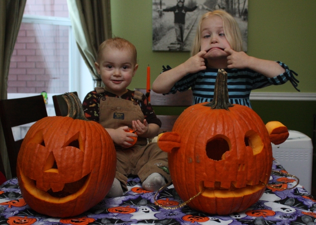 Finally, on Sunday we carved pumpkins. Readers of this blog will not be surprised that Evie requested that her pumpkin be crying, with tears running down its face. That being said, I am quite proud of the way hers turned out, very sad looking. Evie was a good model, fake crying for me whenever I needed it, to get the look right. She wanted my pumpkin to be angry / scary and Sara’s to be happy. She helped do hers, but got bored long before everything was done. That’s okay, I had fun doing it. Plus I have a bunch of roasted pumpkin seeds to eat now!