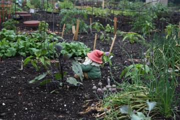 Evie has noticed that he’s not in the garden, but hasn’t caught on yet that he’s gone for good. So far, I haven’t had the heart to tell her. He was certainly a positive part of the garden, and our only protection against the shark (who unfortunately did not get stolen, and still menaces our plot from his lofty plastic perch).