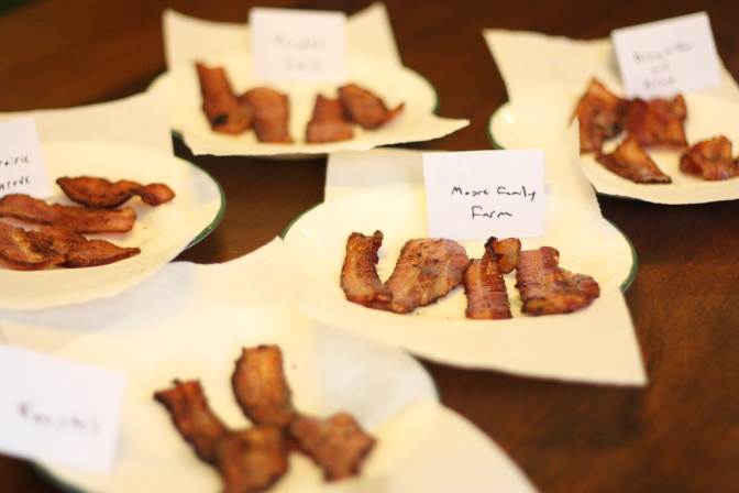 Of course, the main feature of baconfest is the annual taste test. We had a nice collection of bacons this year. We didn’t get as many sort of rare or local varieties as I would have liked (especially compared to last year), but overall I thought everything was really good. It was a pretty wide range of flavors and appearances.